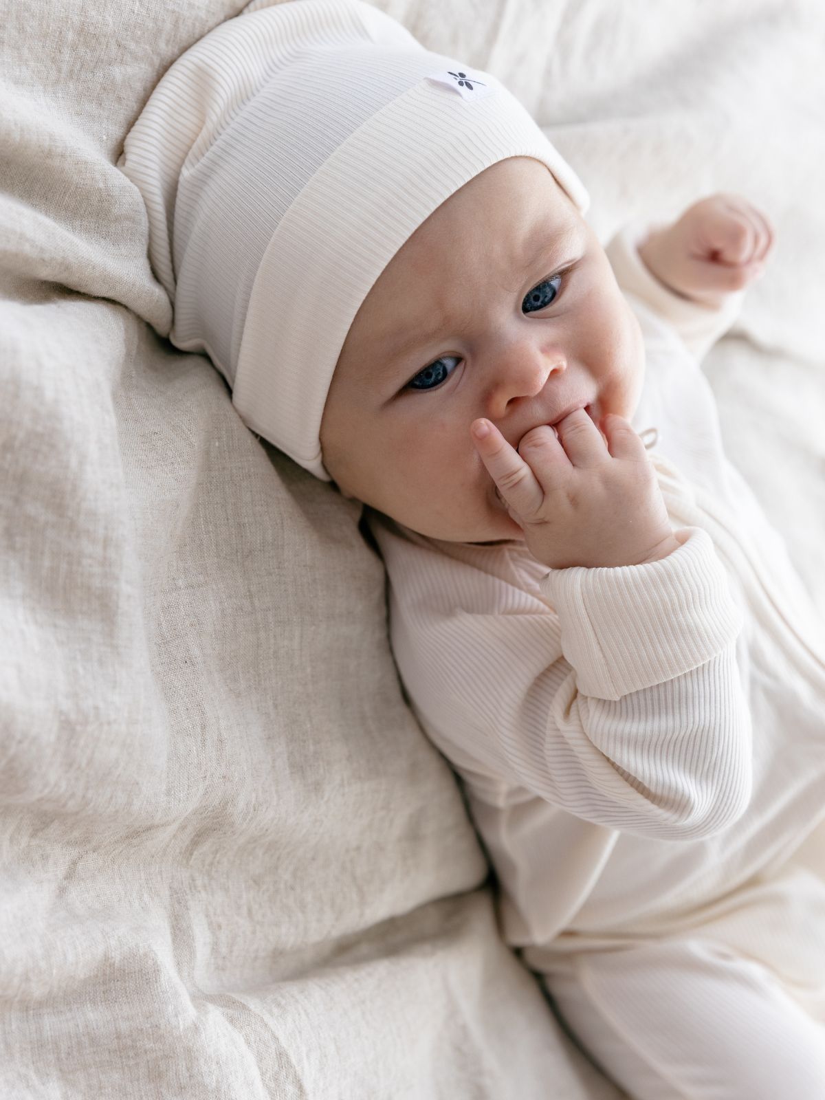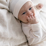 Completa el look de tu bebé con este gorrito de bambú color crema con doble nudo. Protege su cabecita con estilo y combínalo con el resto de la colección para un conjunto completo.