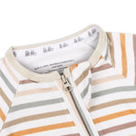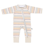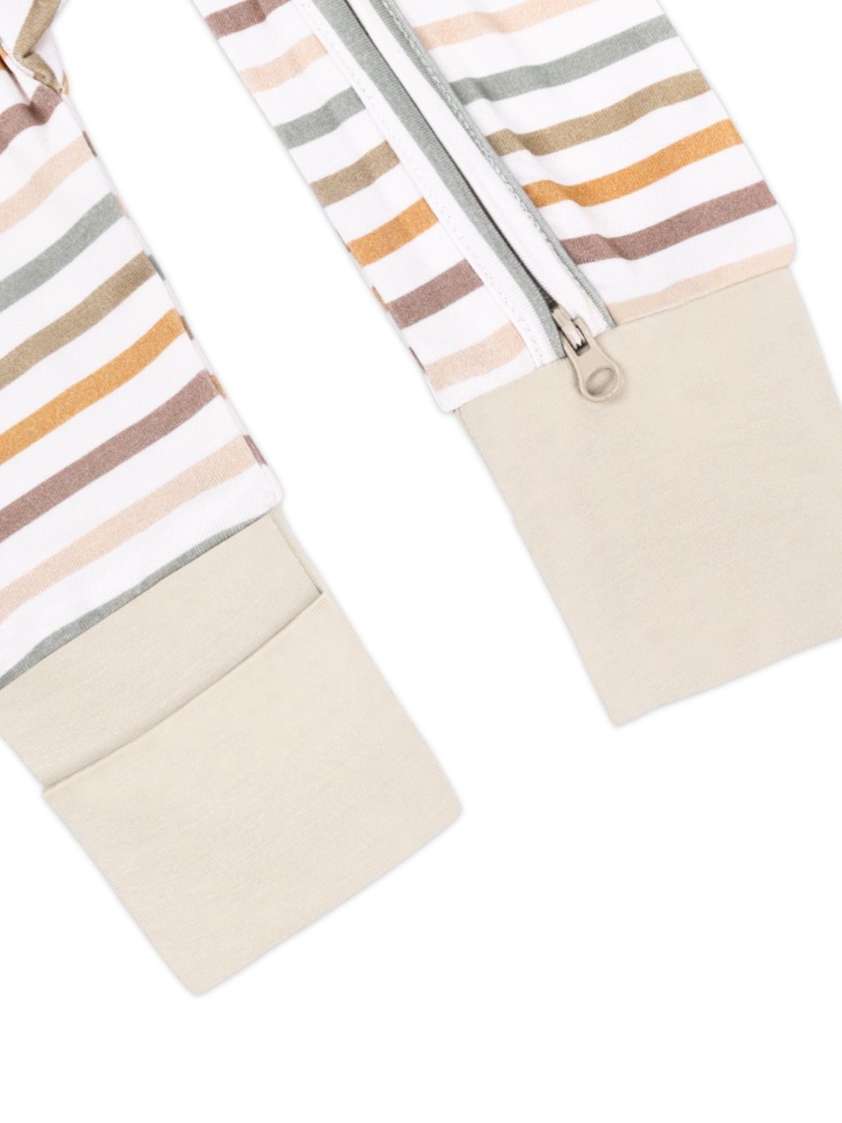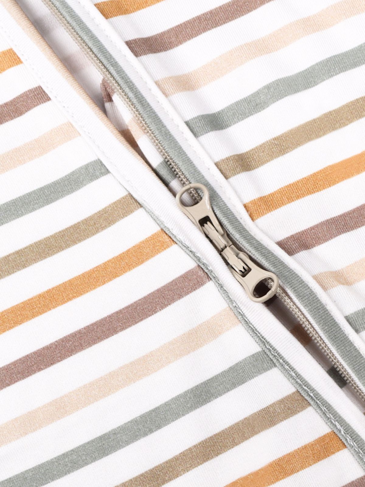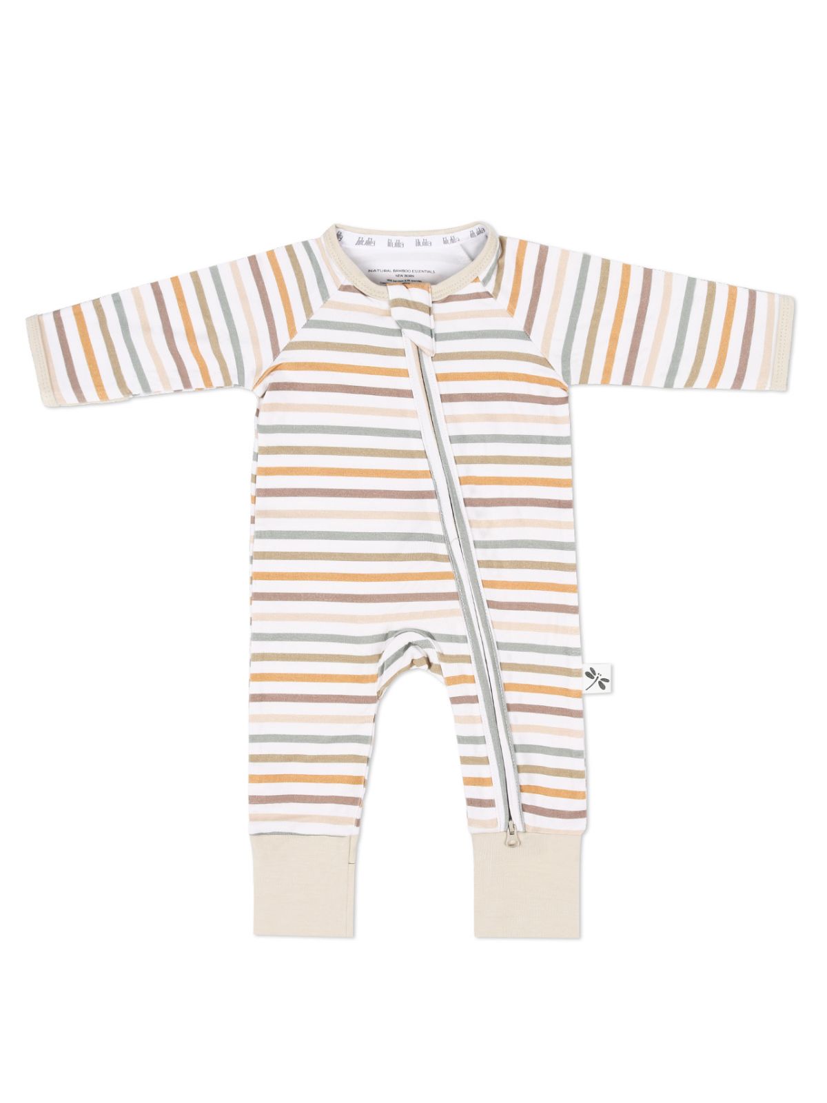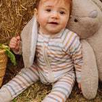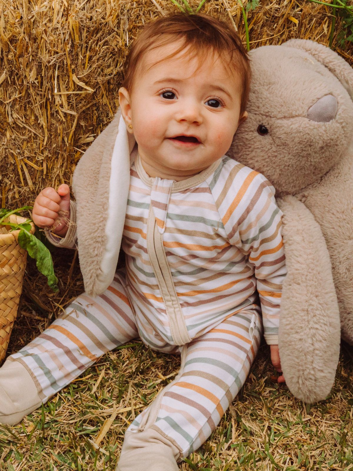 Mameluco práctico con estampado Farm Stripes, hecho de fibra de bambú súper suave. Con cierre de doble sentido para cambios de pañal sin problemas. ¡Libertad y comodidad para tu bebé en un solo zippy romper!
