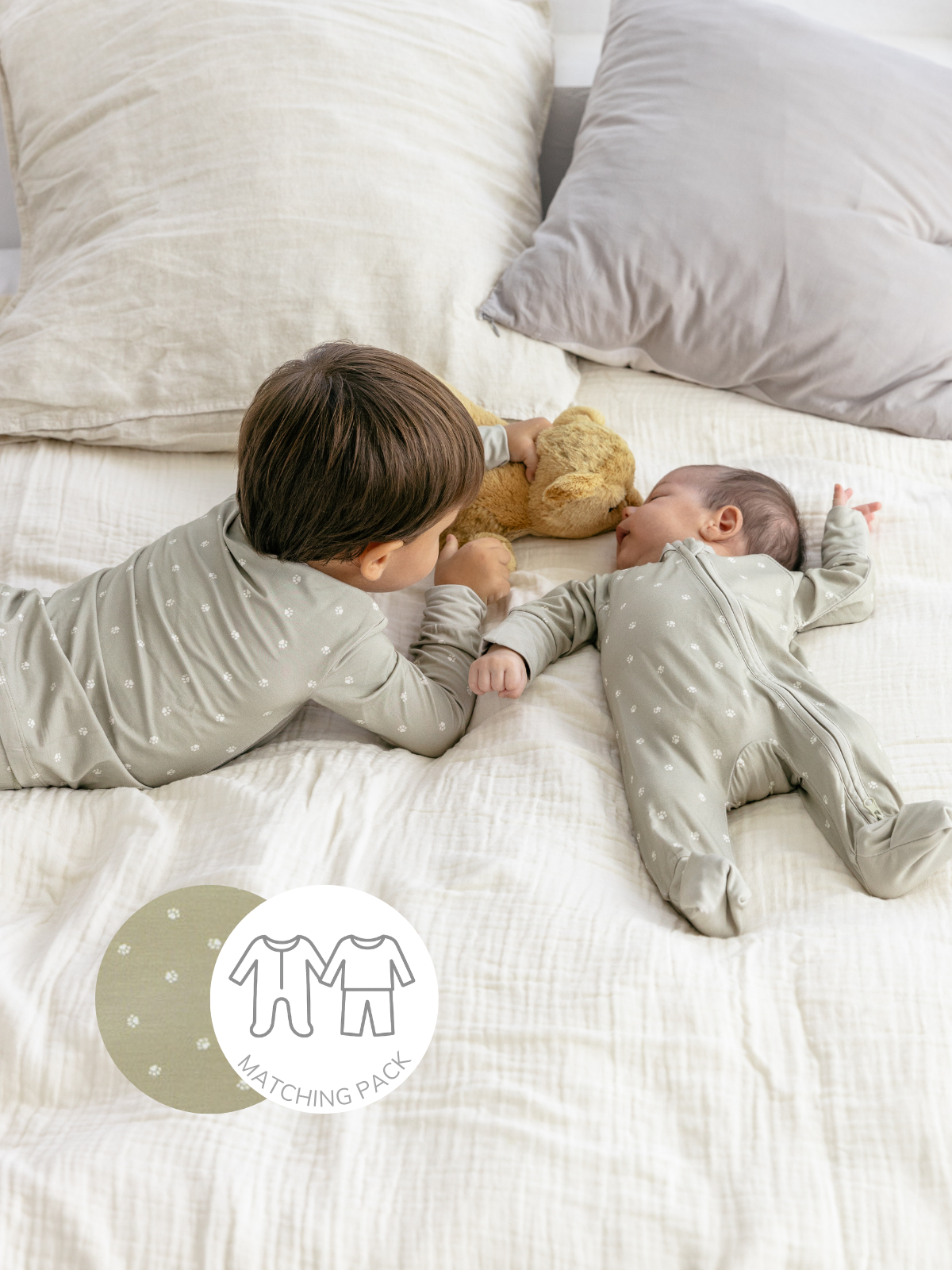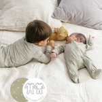 ¡Hermanos, a juego! Este pack incluye un mameluco y pijama a juego con el adorable diseño de Lion Footprints que los hará lucir combinados y tiernos. Elaborados en suave bambú, son perfectos para dormir bien y jugar sin restricciones. La tela respira naturalmente, mantiene la piel feliz y es tan suave que querrán usarlos todo el día.